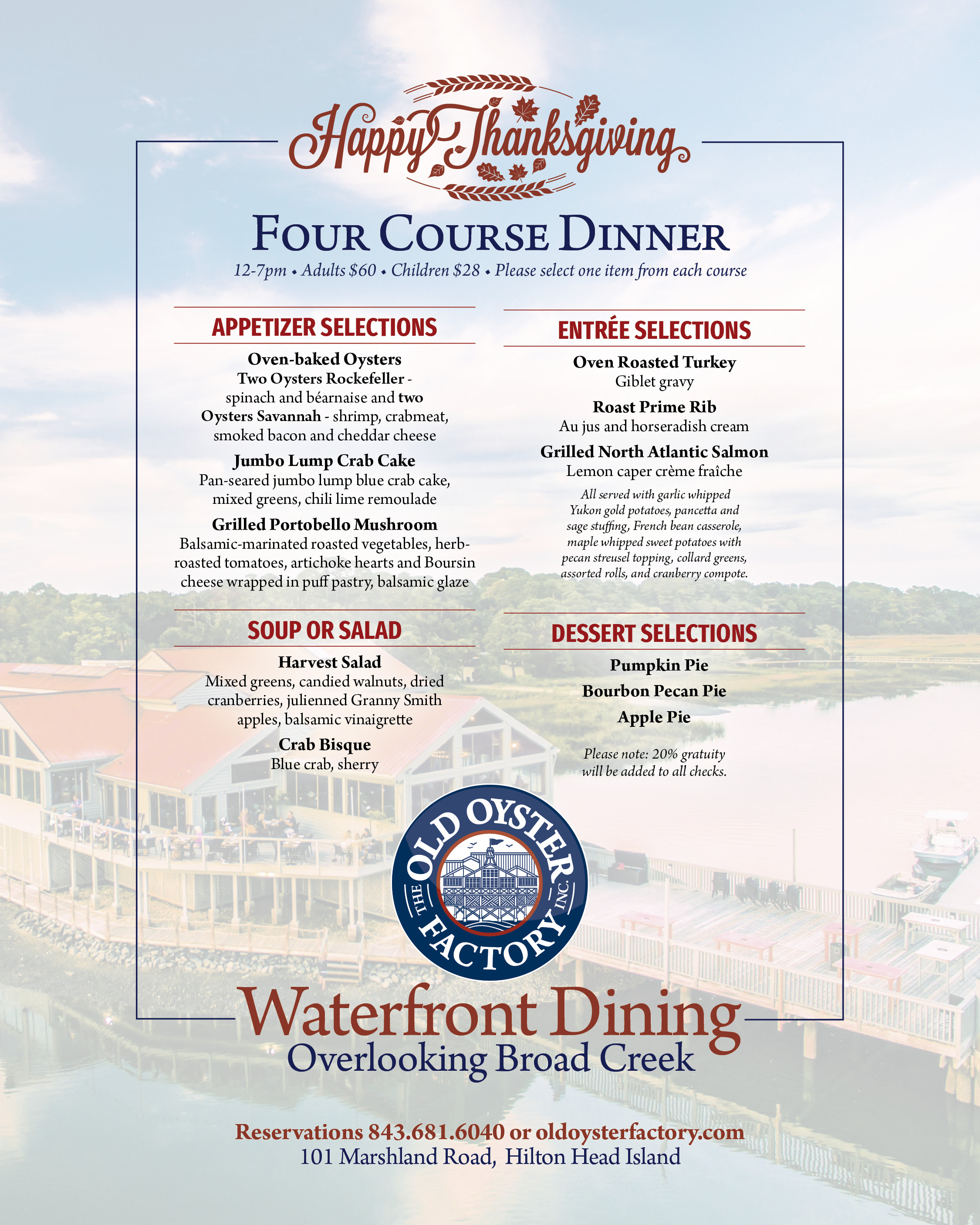 Voted one of the Top 100 Scenic View Restaurants and Top 50 Kid-Friendly Restaurants in America, by OpenTable. Overlooking Broad Creek, The Old Oyster Factory has been a beloved waterfront Hilton Head restaurant for families and children of all ages since 1989. With fresh-caught seafood and a wide range of steaks and delicious desserts, you'll be sure to enjoy your meal while taking in one of Hilton Head's best panoramic views of the marshland landscape. Enjoy many varieties of fresh oysters and seafood at the oyster bar! Open daily for lunch, dinner and happy hour, plus brunch on Sunday.